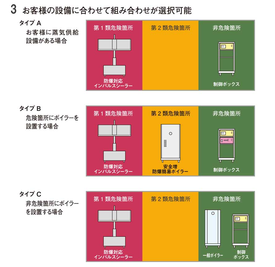 「危険雰囲気を生成する恐れのある場所で包装作業を行いたい」と言うご要望は、以前からありましたが、従来のインパルスシール技術ではこれにお応えすることができませんでした。