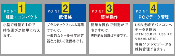 このニーズにお応えすべく、高額となりがちな測定器からプラスチックフィルムに特化する必要な機能だけを搭載した「シール強度測定器:PTT-100」。