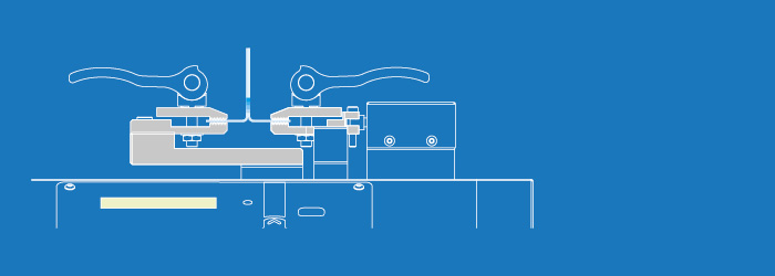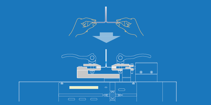1 附属の「試験片セット治具」で "チャック部" に作成した試験片を挟み込み固定します。