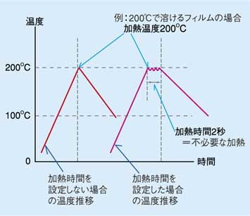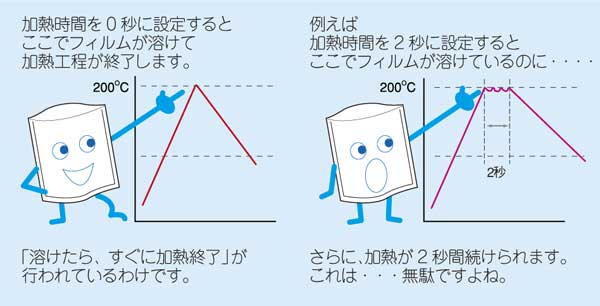 加熱時間を設定しますと、設定した時間の間、フィルムが溶ける加熱温度を加え続けることになります。(下イラストのピンク色のグラフ曲線)