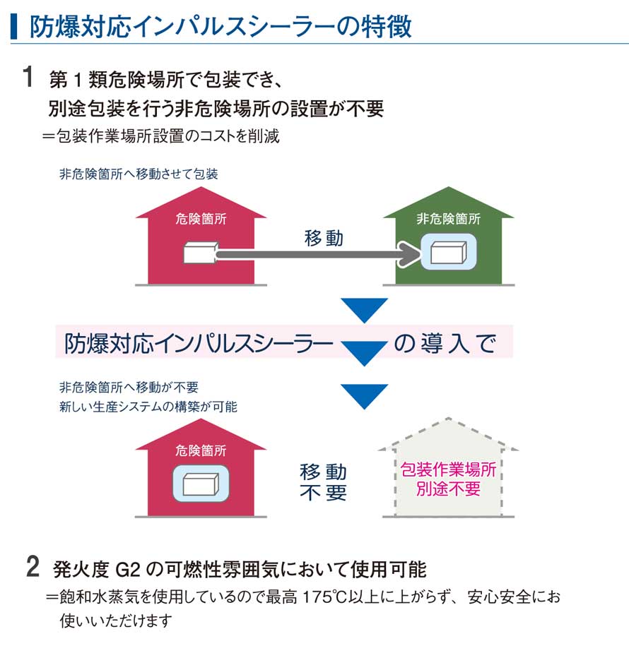 「危険雰囲気を生成する恐れのある場所で包装作業を行いたい」と言うご要望は、以前からありましたが、従来のインパルスシール技術ではこれにお応えすることができませんでした。