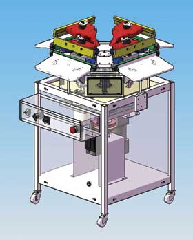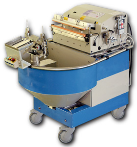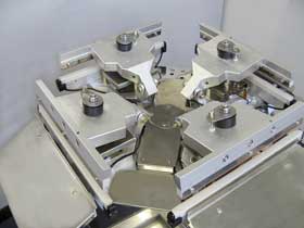 富士インパルス:インデックスシーラーは、間欠回転するインデックステーブルに4台の電動シールユニットを搭載し、定位置でシールユニットに袋を供給、連続的にシーリングを行うことが可能です。