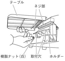 1. テーブルに付いている樹脂ナット(白)をはずし、テーブルのネジ部をホルダーの穴に差し込みます。