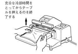 ショップシーラー;FS-215、FS-315は加熱終了後、テーブルを押さえたまま(フィルムを挟み込んだまま)の状態を保つことでフィルムを冷却して固めます。