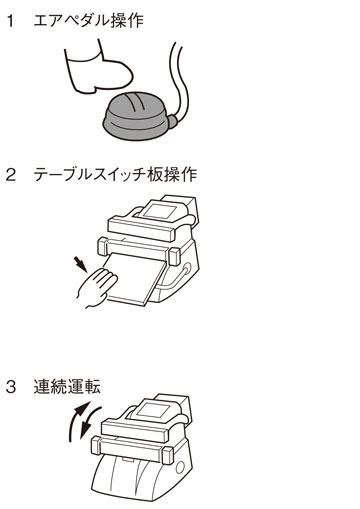 コントロールユニットの「連続運転ON/OFF」ボタンでマニュアル操作か連続運転かの選択ができます。OPL-200、OPL300シリーズのマニュアル操作は「テーブルスイッチ板操作」も選択できます。