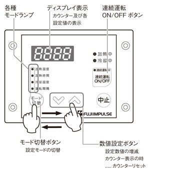 コントロールユニットで加熱温度・加熱時間(加熱温度保持時間)・冷却温度・運転間隔時間を設定します。