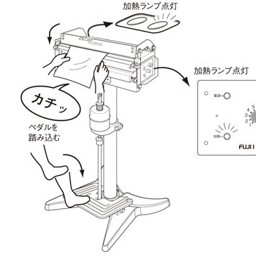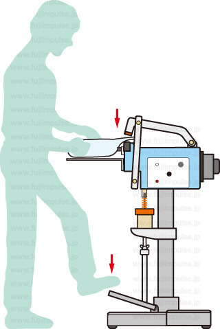 シーラー側のタイマーで加熱時間を設定し、圧着保持器PK側のタイマーで圧着保持(=冷却)時間を設定して袋をシール部にセットします。後はペダルを踏むだけでシールができあがります。