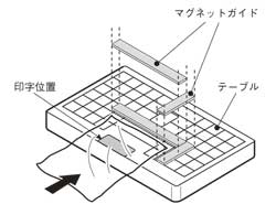 附属品の印字マグネットガイドを包材の角に合うようにテーブルにセットします。