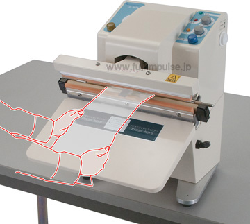 2 袋をシール部にセットし、テーブルを押し下げると袋が圧着レバーに挟み込まれます。この時、袋内にガス充填用ノズルが入るようにします。