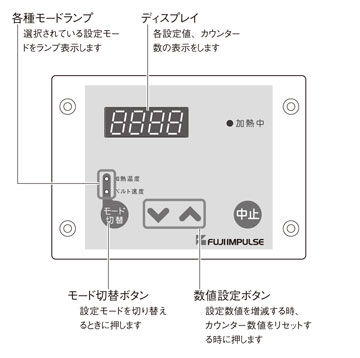 コントロールユニットで加熱温度、ベルト速度の設定を行います。袋(フィルム)の材質、厚さなどにより設定値は変わりますので、異なる袋(フィルム)を使用される時はその都度設定してください。