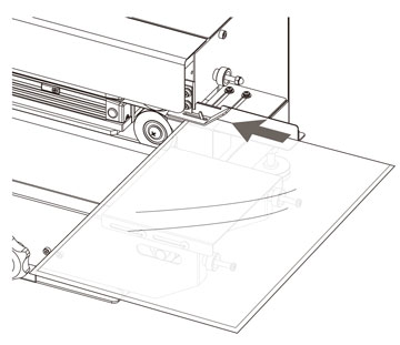 下イラストのようにシールゲージに沿って袋端を袋挿入部に差し入れるとフィルム検知スイッチがON状態になり、ベルトが回転を始めます。袋端をベルトで挟み込む位置まで袋をスライドさせて挿入してください。