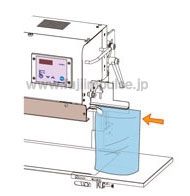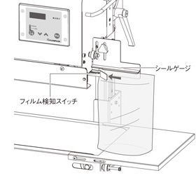 2 シールゲージに沿って袋端を袋挿入部に差し入れるとフィルム検知スイッチがON状態になり、ベルトが回転を始めます。袋端をベルトで挟み込む位置までスライドさせて挿入すれば、シールがスタートします。