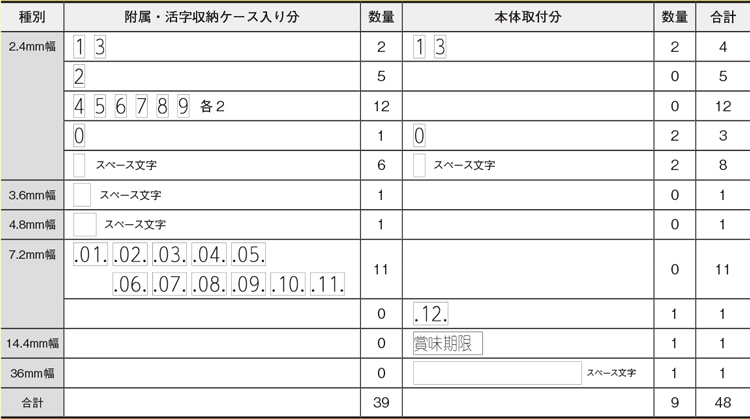 各製品の 附属活字の一覧は、こちら ![]()