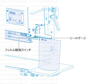2 シールゲージに沿って袋端を袋挿入部に差し入れるとフィルム検知スイッチがON状態になり、ベルトが回転を始めます。袋端をベルトで挟み込む位置までスライドさせて挿入すれば、シールがスタートします。