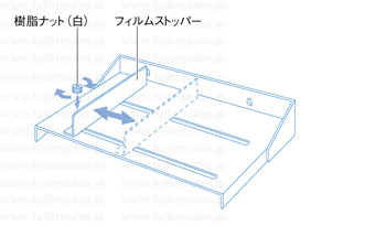 2 テーブル上の樹脂ナット(白)を緩め、フィルムストッパーを移動させて左右位置の調整をします。