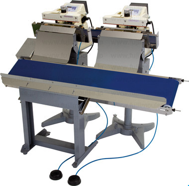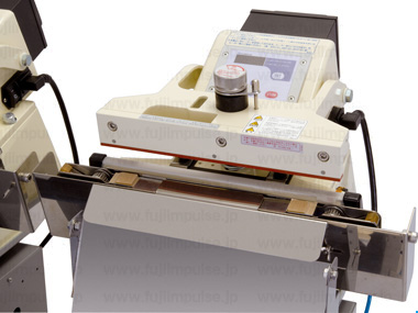 シール部の位置で包材をホールド、シール後包材をテーブルからコンベアに滑り落す機構を持ち、コンベアを併用すれば搬送までの作業を行うことができます。