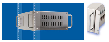 附属のブラケットを取り付けていただくと、システムラックへ組み込んでいただくことができます。