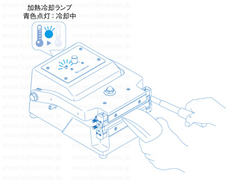 青色に点灯中は、圧着ハンドルを手前に引いたままの状態を保持してシール冷却を行ってください。
