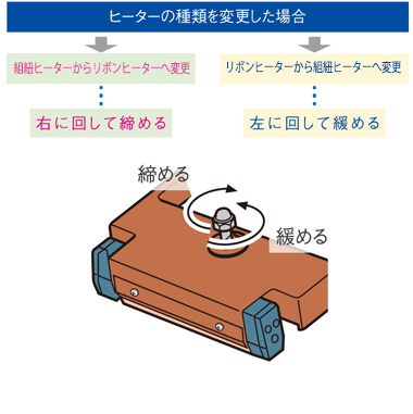 3 組紐ヒーターとリボンヒーターでは、ヒーターの厚さが異なります。 "組紐ヒーターからリボンヒーターへの交換" または "リボンヒーターから組紐ヒーターへの交換" をした場合は、加熱時間の調整、シール圧力の調整が必要になる場合があります。 シールテスト行っていただき、きれいなシールができない場合は加熱温度を調整および下記をご覧いただき、シール圧力の調整を行ってください。(工場出荷時には組紐ヒーターを装着し、組紐ヒーターに適したセッティングを施しています。)