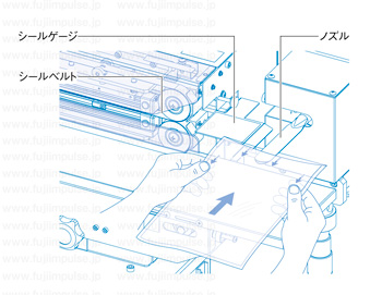 袋をスライドさせるとノズルが横方向に動きシールベルトが回転を始め、シールがスタートします。