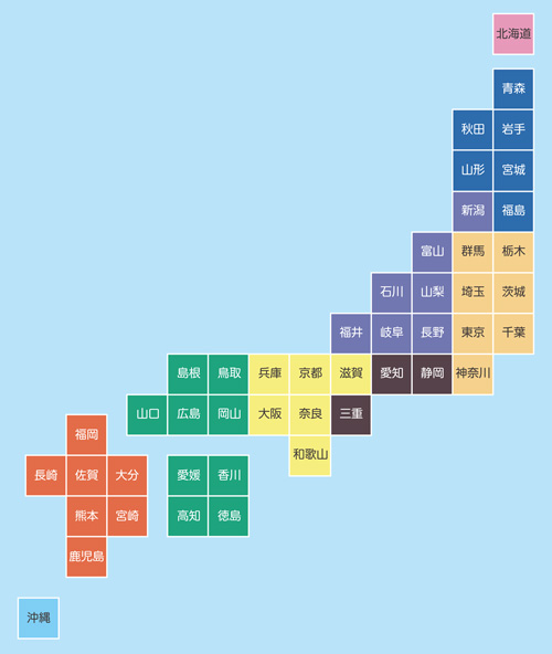北海道 / 東北 / 関東 / 甲信越 / 中部 / 近畿 / 中国・四国 / 九州・沖縄