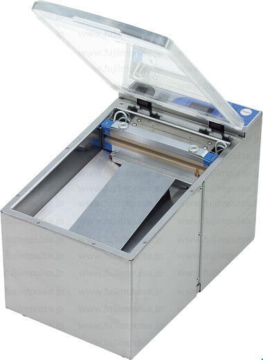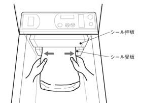 本体の開閉フタを開けて、内容物の入った袋(フィルム)の袋端をシール受板、シール押板の隙間に入れてください。