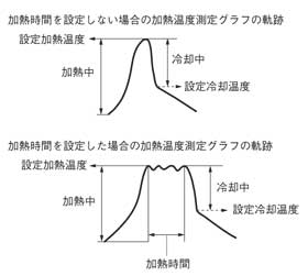 ・ 温度制御における加熱時間とは設定された温度を維持させる時間のことで、通常は、加熱時間を設定しなくても(加熱時間を0.0秒にしても)シールはできます。袋(フィルム)に厚みがあり、加熱温度を上げてもシールができない場合やシールができてもフィルムがダメージを受けている場合のみ加熱時間を設定すると効果が期待できます。