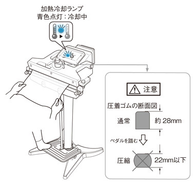 加熱冷却ランプの青色発光が消灯し、シール終了のピッという合図音が鳴りましたら、冷却が終了です。ペダルを踏む操作を終了させると、圧着レバーが上がり、シール完了です。
