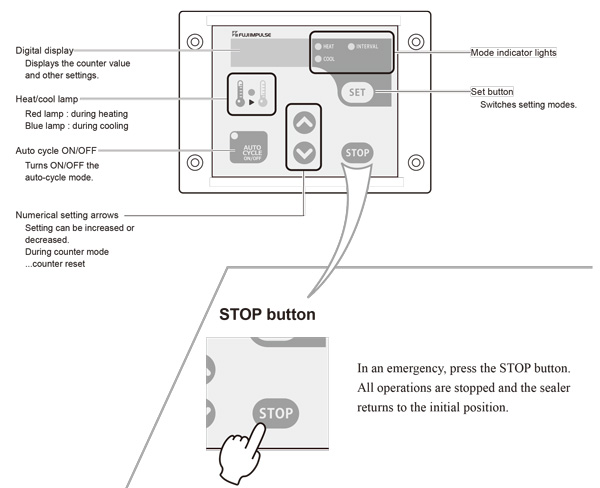 Use control unit to set conditions such as heating time. Press SET to switch setting mode. After setting the appropriate sealing condition for the packaging material, select either automatic continuous operation or manual air pedal operation.