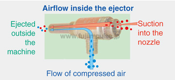 When compressed air is sent through the nozzle in the direction of being ejected from the machine, a phenomenon occurs in which all air in the nozzle is pulled in the same direction. The ejector vacuum method takes advantage of this phenomenon.