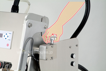 By turning the adjuster knob, the tilt angle of the head can be variably adjusted between 0 and 90 degrees to suit the package content. For example, when packaging powders, tilting down the sealer head will allow the sealing to complete without powder spilling from the bag opening.