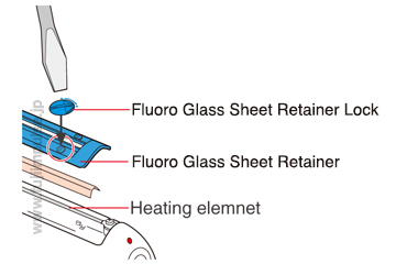 The heating element and other relatively frequently replaced parts are easily replaced by removing the Teflon-sheet holder. Simply remove the Teflon-sheet holder using a flat-head screwdriver.