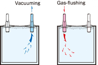 With one nozzle set for gas flushing and the other for vacuuming, the circulating gas-flush method increases gas-replacement rate by de-airing the bag even as it is being filled with gas.
